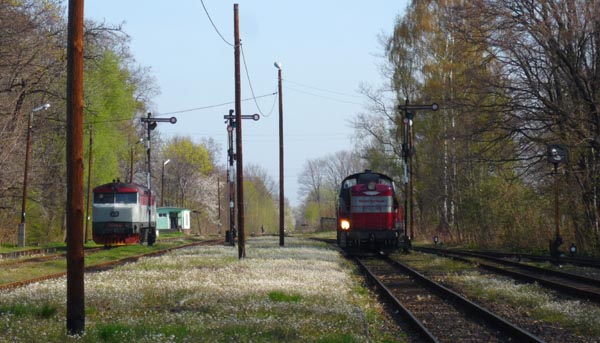 | Vjezd do koncové stanice Svobodné Heřmanice - tudy už jezdí pouze nákladní vlaky. | Zde čekal zlatý hřeb akce - půl kilometru dlouhý lom na břidlici, jenom o něco zmenšená kopie Velké Ameriky. Pohledy byly úžasné a nevykoupat se, byť byla zima a my už se ráno koupali, by byl hřích. Pro potápěče čtyř národností, kteří v lomu trénovali, jsme byli zajímavou atrakcí. Od lomu jsme se vrátili zpět k dráze a pokračovali rozlehlými lesy po tělese bývalé trati do Benešova. Zkušené oko železničního archeologa zde jasně rozeznávalo trsu bývalé trti, která e pozvolnými oblouky, mírným stoupáním a rýhami po stranách zřetelně odlišovala od ostatních rozbahněných lesních cest, Občasný kilometrovník byl jasým důkazem.
