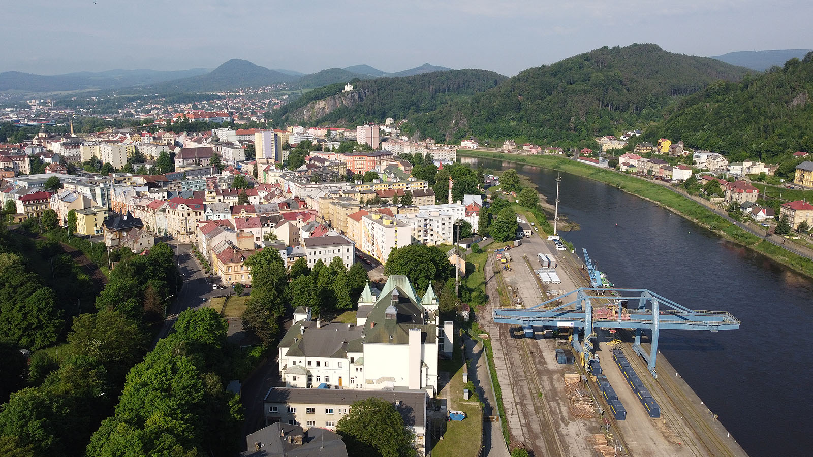 | | Z dronu je hezky vidět nahoře starokatolický kostel bez střechy, vpravo od něj vyhlídka Bohemia a ještě dál vpravo dole severní portál Loubského tunelu. |