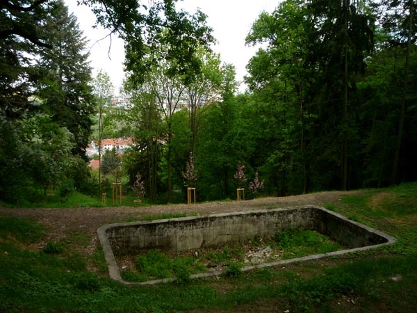 Po ulici s výmluvným jménem Úpatní (kolem uličky Palouk) jsem došel až na uježděnou cestu, která vypadala nejvíc jako stezka k zahrádkářské kolonii. Naproti mým očekáváním ale nekončila drátěnou brankou, nýbrž vedla do zvláštního údolíčka. Za poslední stavbou, luxusní vilkou již na okraji lesa s výhledem na Brno, která musí být ideálním místem pro život, jsem vstoupil na zvláštní území: v poměrně prudkém svahu se tyčily zdánlivě nesmyslně terasovité plošinky a náspy, skoro jako pozůstatky nějaké dávné drážky, nebo spíše lanovky. Sem tam ze země vyčnívala kamenná lavička a společně s křovinami, kterými území přecházelo v les, dávala tušit, že jde o zvláštní zpustlou zahradu. Zlatým hřebem byl vypuštěný bazén. Koupání pod širokými korunami stromů, v zapadlém údolí vonícím trávou, s výhledem na město v hloubce pod sebou - to musel být zážitek!