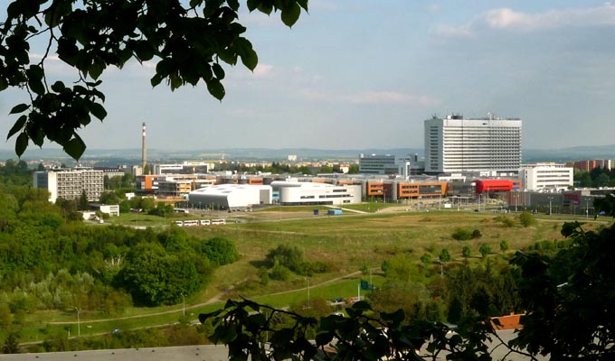 Krásnou stezičkou mezi čerstvě olistěnými buky a duby jsem pak pokračoval po úbočí kopce na sever, překvapen a potěšen svým objevem probouzející se »země nikoho«. Z neznámého parku se nabízela plejáda výhledů na nový kampus, kontroverzní to univerzitní dílo, a nakonec jsem neodolal a vylezl na rozložitou lípu, abych pořídil také několik panoramatických snímků svého působiště. No není tam krásně?