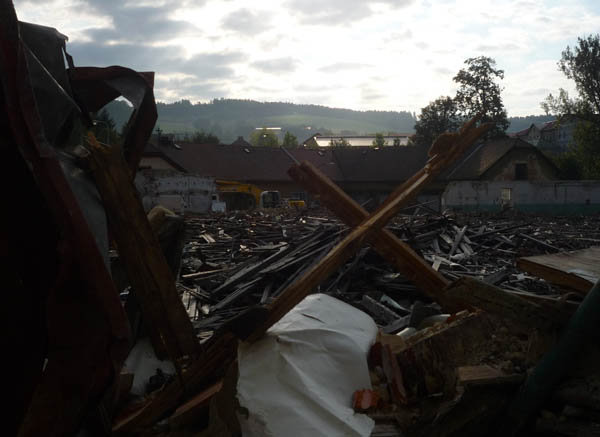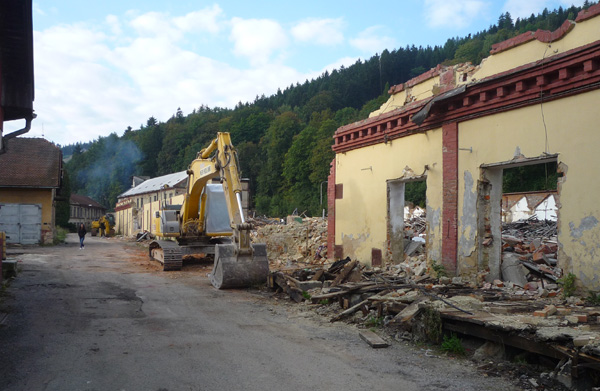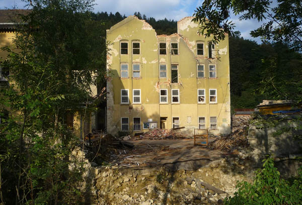 Osud mé oblíbené továrny mně však nedal spát a zamířil jsem na sever o týden později znovu a lépe vybaven. Nevěděl jsem, co ještě na místě zbývá k nafocení, ale štítová zeď pořád ještě stála celá. Nafotil jsem další panoramata a odvážil se boční branou i do areálu, odkud mě však rázem vyhnal starší muž. Hlídač, který už neměl co hlídat, mně alespoň sdělil, že továnu bourá její nový majitel, kterého zde má v lásce asi jen málokdo a také, že představy o využití místa jsou poněkud mlhavé. Snad zde prý vyrostou přízemní sklady bez špetky architektonického umění. Mezitím za mnou snědá dívka zevnitř důkladně zavřela a uzamčela vrata. Co kdyby nezvaný cizinec nafotil něco, co majitel rozhodně nechce zveřejnit? O moc víc mně neřekla ani paní pošťačka a tak jsem dofotil, snědl jablko ze stromu opodál a vydal se na zpáteční cestu.