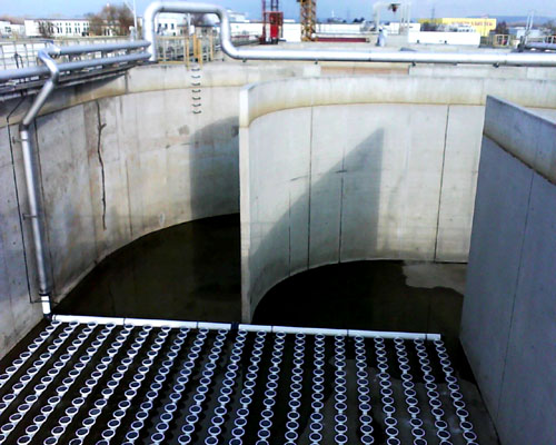 Popis: Během několikaměsíční odstávky části provozů čistírny odpadních vod v Modřicích u Brna bylo možné spatřit části zařízení, které jsou jinak trvale ukryty pod vodou. V době naší exkurze byla polovina ČOV odstavena a navíc došlo k nevysvětlenému úhynu bakterií ve vyhnívacích nádržích, tudíž výkon zařízení výrazně poklesl. Na snímku jsou provzdušňovací růžice na dně několik metrů hlubokých nádrží.