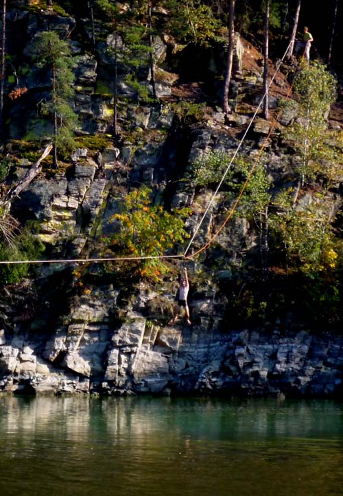 Popis: Na 18. a 5. výročí adamovských klubů Orionu a Eridanu, které se konalo na ostrově Kozlově v Dalešické přehradě, jsme se konečně odhodlali vyzkoušet novou kladku a postavit lanovku. Natažení 130 m dlouhého lana přes přehradu nám dalo opravdu zabrat, ale jakmile se to na čtvrtý pokus konečně podařilo, nechtělo neustálé sjíždění po laně do chladivých vln jezera vzít konce a vyhnal nás až večerní soumrak.