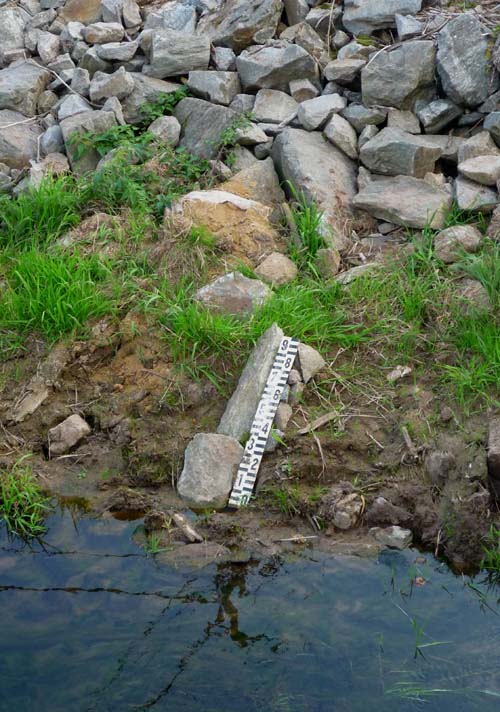 Popis: Velmi podivně umístěný vodočet, který má měřit hladinu potoka Lubě v Drásově nedeleko soutoku s řekou Svratkou. Chatrné zařízení volně položené na kamenitém nábřeží nedaleko nedostavěné tzv. Německé dálnice mě zaujalo natolik, že jsem si je vyfotil.