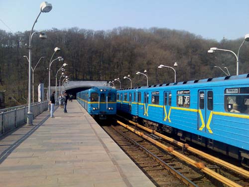 Popis: Stanice Дніпро leží na mostě, který navazuje na tunel - Kyjev je stejně jako řada dalších ukrajinských a ruských měst vystavěn na desítky metrů vysokém pravém břehu řeky, která se do něj po miliony let zařezává vlivem nesymetrické Coriolisovy síly.