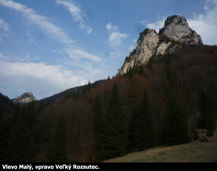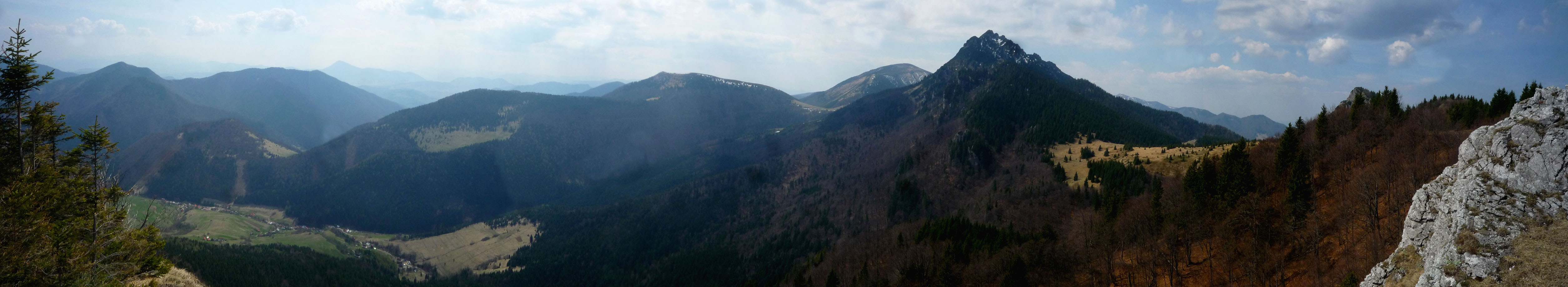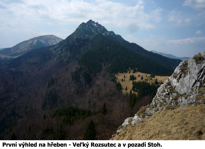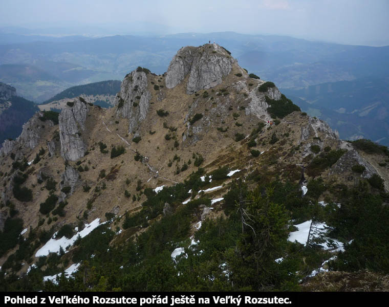 Na vrcholku jsme se skromně nasnídali a chvíli sušili zpocené svršky i sami sebe ve sluníčku, které mezitím začalo hřát. Narozdíl od údolí, nahoře v horách ještě stromy nezdobily zelené lístky a krajina oplývala pouze odstíny žluti a šedi včetně bílé a černé. O kousek níž v sedle pak Jouza pohlídal batohy a zbylá čtveřice se vydala dobýt další vrcholek - Malý Rozsutec (1344 m n. m.), kam jsem po řetězech vystoupal opět první a dráždil Sviště výsledkem 2:0 na vrcholy. Šplhat na Velký Rozsutec s batohy se nám nechtělo a tak jsme vrchol obešli po modré značce a na Romainův popud naplánovali okruh, který půjdeme bez batohů. Ty jsme schovali v bukovém houští opodál, přikryli je Jouzovou celtou a vydali se nejprve na Veľký Rozsutec (1609 m n. m.), kde stanul první Svišť a začal dotahovat na 2:1. Odsud jsme sešplhali do Horných dier a zamířili na večeři do Štefanové (nedostatek jídla zapříčinil, že jsme se šli najíst do restaurace). Hřebem večera pak byly makem plněné knedlíky s grankem, které si objednali někteří z nás (bohužel vyjma mě) a na něž mám dosud chuť. Když jsme s plnými břichy vystoupali zpět do sedla Medziholie, padl už na krajinu soumrak a začalo pršet, proto jsme narychlo postavili přístřešky a v místě, kde sedlo přecházelio v sráz jsme se vydali do říše snů. Protože pršelo, oheň jsme opět nerozdělali; ale přestože pršelo, bylo mně v zimním spacáku celou noc nepříjemně horko.