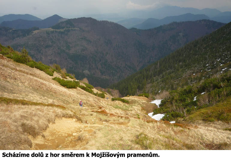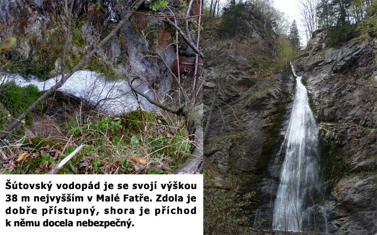 Důvod jeho počínání byl zřejmý - jako rozený pedagog (a v souladu se svým pečlivě připraveným itinerářem, který jsme však - díky bohu - naprosto nedodrželi) nám chtěl představit dvě významné zajímavosti zdejšího pohoří - nejprve zvláštní Mojžíšove prameny, kde uprostřed pastviny ze skalky několik metrů vysoké tryská pramen horské vody zvící mužského stehna a o něco níže na potoku z pramenů vzniklém položený Šútovský vodopád, který i mě překvapil svojí výškou. Úvahy o chladivé sprše nadobro pohřbila další dávka běloskvoucích turistů, kteří právě dorazili procházkou od nedalekého parkoviště. Jsme tedy zpátky dole v civilizaci.