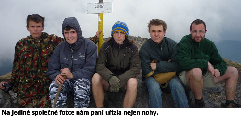 Kluci se na chatě občerstvili a očistili, načež jsme schovali batohy pod turistickou verandu se stoly a židlemi a vyrazili na lehko do posledního závodu. Chatrná strava se však na Svišti projevila a tak jsem za hřmení bouřky nad Štefanovou a v impozantním vichru dorazil jako první na nejvyšší bod Malé Fatry Veľký Kriváň (1709 m n. m.) a zvítězil nad Svištěm 5:2 se satisfakcí pro »starou generaci«. Vzhledem k větrnému a vlhkému počasí jsme se na vcholu zdrželi jen tak dlouho, aby nás mohla neznámá paní vyfotit (přičemž nám odřízla nohy) a seběhli jsme zpátky dolů k batohům. Únava z trojdenního putování už na nás byla znát a tak jsme vzali za vděk tím, že půjdeme už jenom z kopce, byť nás Romain vedl ještě asi dvakrát delší trasou, než byla nejkratší cesta do Šútova na vlak.