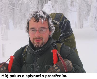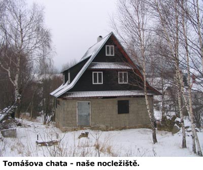Chata, na kterou nás Tomáš pozval (díky!) majestátně čekala ve tmě a netrvalo dlouho a v kamnech vzplály první plamínky. Zašli jsme do sklepa pro dřevo a na plotýnce v provizorní velké místnosti, která zatím zabírá skoro celé první patro, jsme ohřáli vepřovou konzervu a potom uvařili velký hrnec polévky ze sněhu. Na stole svítila nová petrolejka a než jsme zalezli do spacáků (tentokrát na luxusních měkkých pohovkách), stihli jsme probrat širokou škálu témat od GPS přes problematiku stavebních izolací až po kočky v popelnicích. Ráno jsme vstávali až v 10 hodin, ale také díky všudypřítomné zimě netrvalo dlouho a stoupali jsme pěšky nebo běžky, jak kdo chtěl kolmo vzhůru na masiv Králického Sněžníku. Po cestě jsme museli překonat novou školku a ani počasí nám nepřálo. Citelně se ochladilo a tváře nám bičoval ledový vítr a sníh. Navíc jsem měl svoji pověstnou Michelinskou bundu a v ní se dělalo při výstupu nepříjemně horko.