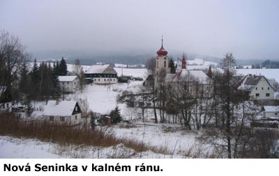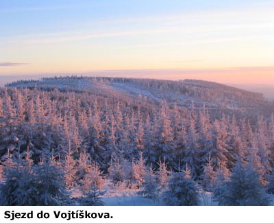 Nevyhnuli jsme se malému bloudění, každý svému druhému pádu do sněhu a Honza elegantnímu skoku na lyžích přes nezamrzlý potok. Nakonec jsme se ale našli a táhlým sjezdem (a pak, že šupiny mají jen výhody - vůbec mně to nejelo) se dopravili až na hranici pojíždětelné sněhové pokrývky. Po přezutí do pohorek a prostudování jízdního řádu jsme naznali, že je načase najít ve Vojtíškově nějakou vyhřátou provozovnu.