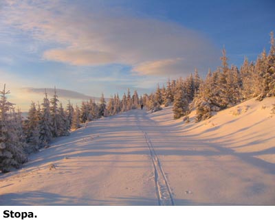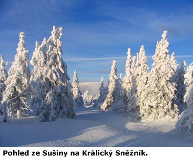 Posilněni jsme se rozhodli nejkratší trasu do Nové Seninky prodloužit okruhem po polských hranicích, což byla vyjížďka po téměř neprojeté stopě (narozdíl od hlavních cest upravovaných rolbou) a následně jsme nesprávně odbočili, takže jsme parádním sjezdem se slalomem po panenské sněhové pokrývce dorazili zpět na hlavní červenou značku u Medvědí boudy. Protože se ale za mraky skryté slunce klonilo k západu, trošku jsme přidali do kroku a asi po hodině stanuli nad údolím Kladského sedla, vysoko nad Tomášovou chatou. Nejlepším zážitkem dne byly dlouhé sjezdy po zasněžených pláních do údolí, kdy z bílé plochy až přecházel zrak. V nejnižších polohách však nebylo ještě dost sněhu a tak jsme museli poslední metry sejít s běžkami na zádech. V údolí mě překvapila prohrnutá cesta na Kladské sedlo, stejně jako informace, že je pro auta zpřístupněna již i cesta z polské strany a tak nebude už za týden stát v cestě přeshraničnímu provozu vůbec nic.