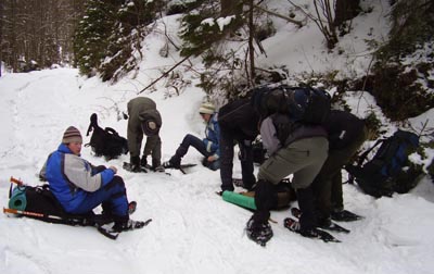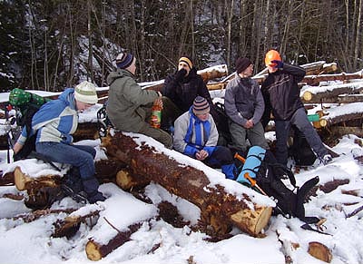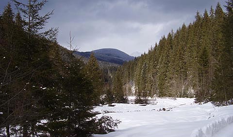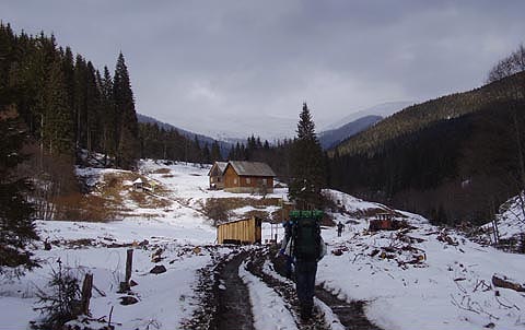 Den se přehoupl do své odpolední části a my jsme pomalu stoupali údolím. Na některých už se začala projevovat únava z neustálého přelézání popadaných kmenů nad potokem a hledání rozpadlých mostků, sněhu přibývalo a jen občas jsme před sebou spatřili modravou masu Поп Івана. K večeru jsme prošli okolo posledních lidských staveb, trosky tábora probouzely chmurné pocity, jsouce zasypány dvoumetrovou vrstvou sněhu se tyčily i s přetrženým lanovým mostem v horní části údolí jako děsivé memento. Také zde končila zřetelná cesta a krátce za táborem jsme ztratili značku. Teď jsme využili svoje zkušenosti z hor.
