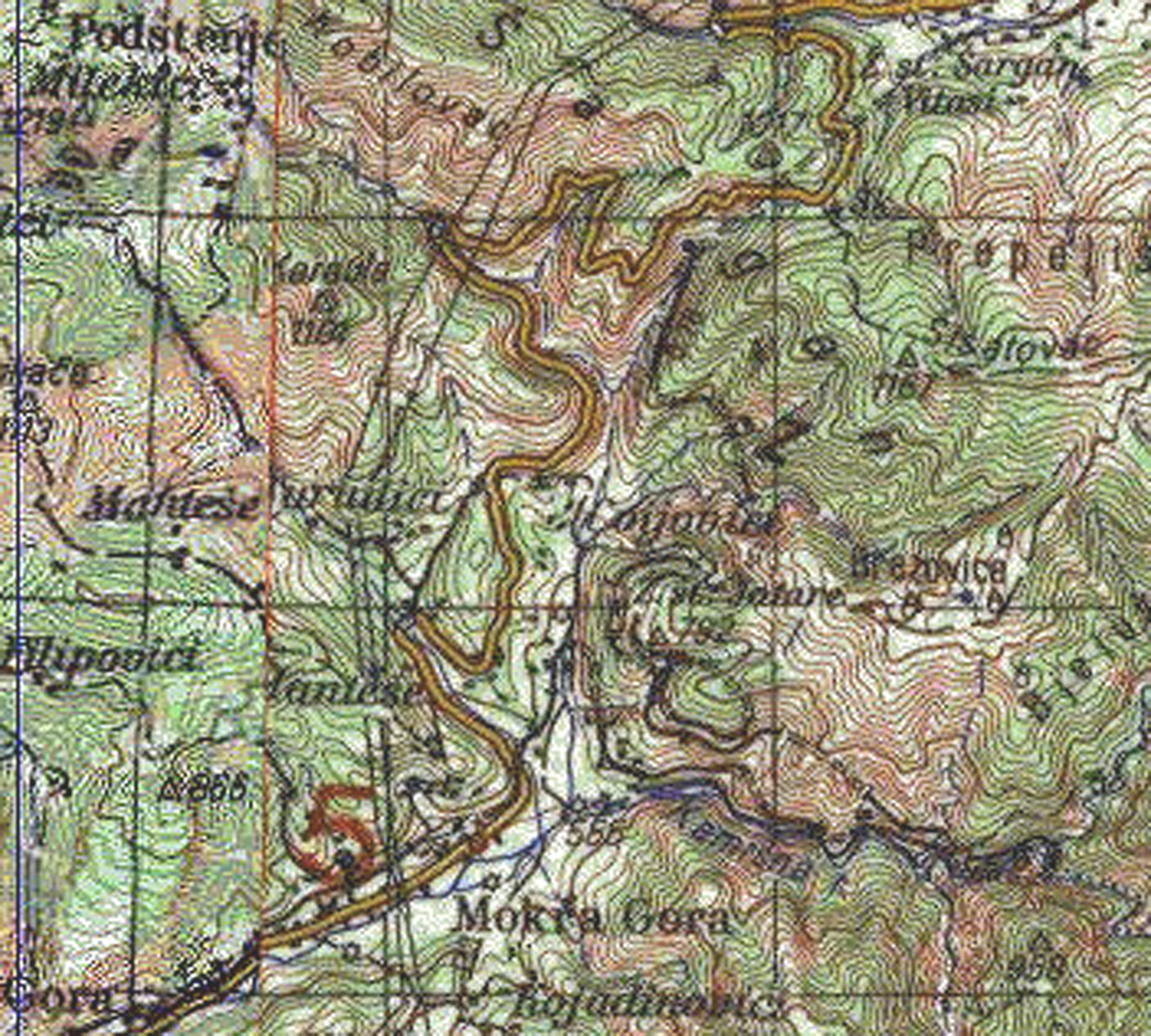 Čtvrtým překvapením pak byl nenadálý průjezd motorové drezíny, se kterou několik zarputilých železničářů vystoupalo 240 m převýšení z plání okolo Mokroj Gory - Мокрој Гори. Fotka se bohužel nepodařila, protože zrovna došla paměť foťáku. Po druhém obědě jsme plni dobrého jídla i optimizmu z definitivní změny ročního období započali celovečerní pouť po samotné osmici přes třicítku tunelů a stanice Jatare - Јатаре a Golubići - Голубићи, proslavené filmem Život je čudo. Osmnáctipromilové klesání ještě umocnil pocit lehkosti, když Wapi vymyslel, že si můžeme schovat batohy v místě, kudy budeme procházet o několik hodin později jen o pár desítek metrů níže, a tak jsme s lehkostí podvečerních motýlů proplouvali tunely a nořili se tu na jednom, tu na druhém úbočí kopců jako v zrcadlovém labyrintu. Přes veškerou snahu o orientaci musím přiznat, že jsme v té spleti kolejí chvíli nevěděli, kde přesně jsme a z kterého tunelu na protějším svahu se vynoříme za chvíli, zamotaní a propletení skrz na skrz.